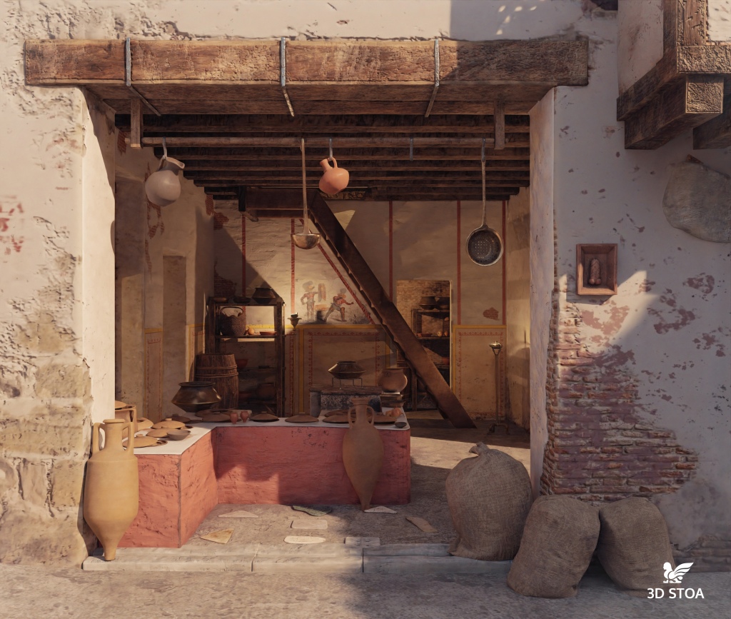 Saliendo de la arena, hemos recreado esta caupona, que nos habla de todo lo que rodeaba a los juegos gladiatorios: comida y bebida, adquisición de fichas de acceso, ocio de distinto tipo, etc.