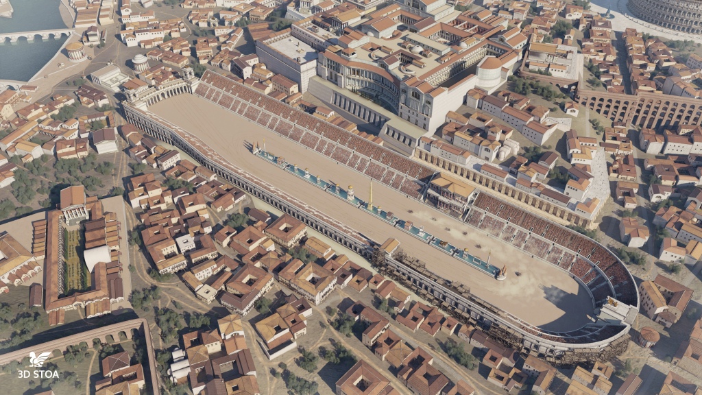 Y como los juegos no se limitaban al anfiteatro, recreamos el área del Circo Massimo durante una de las carreras que tuvieron lugar en él. Parte de la estructura se encontraba en obras en el año 96 d.C. en el que ambientamos la reconstrucción, y así la hemos representado.