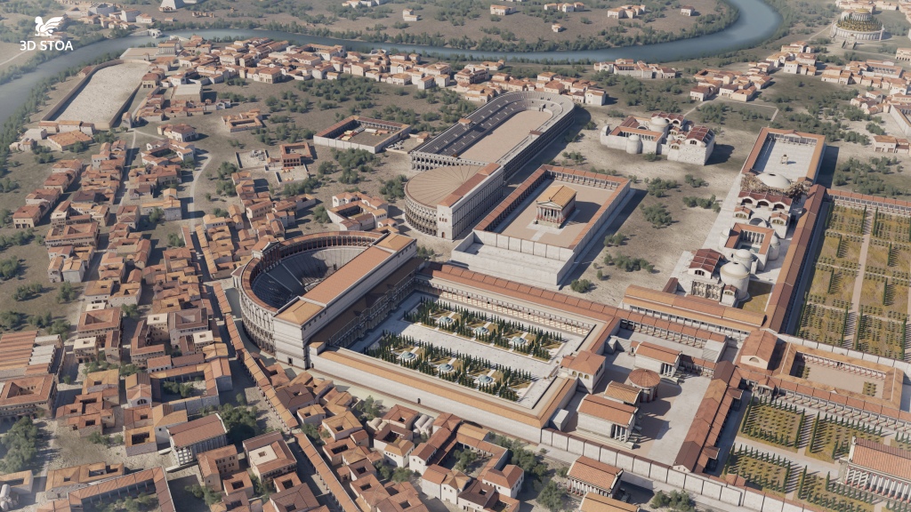 El ocio, el deporte y la cultura en la antigua ciudad de Roma continuaban más allá, también en el Campo de Marte, donde se levantaban edificios como el Teatro de Pompeyo, el Odeón y el Estadio de Domiciano, y que representamos en esta vista de la zona.