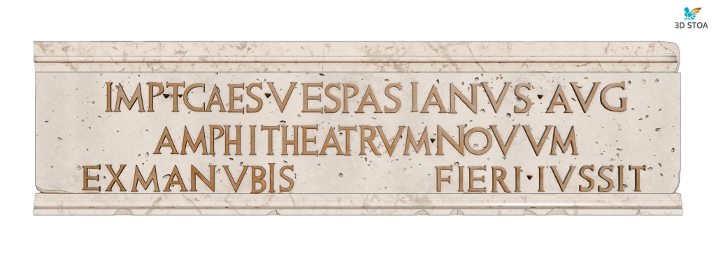 Hemos recreado, también, la inscripción inaugural del Coliseo: «El emperador Tito César Vespasiano Augusto mandó que se construyera con el botín de guerra el Anfiteatro Nuevo«. Y es que éste fue el nombre que se dio al anfiteatro en su inauguración.