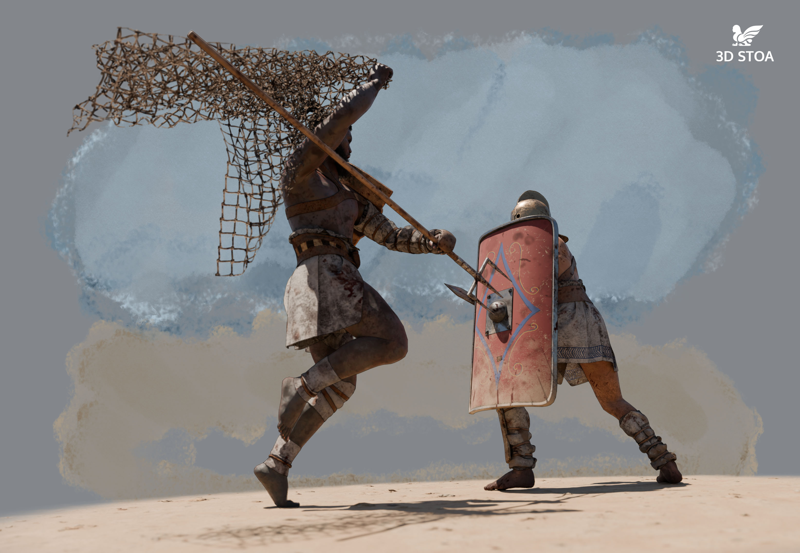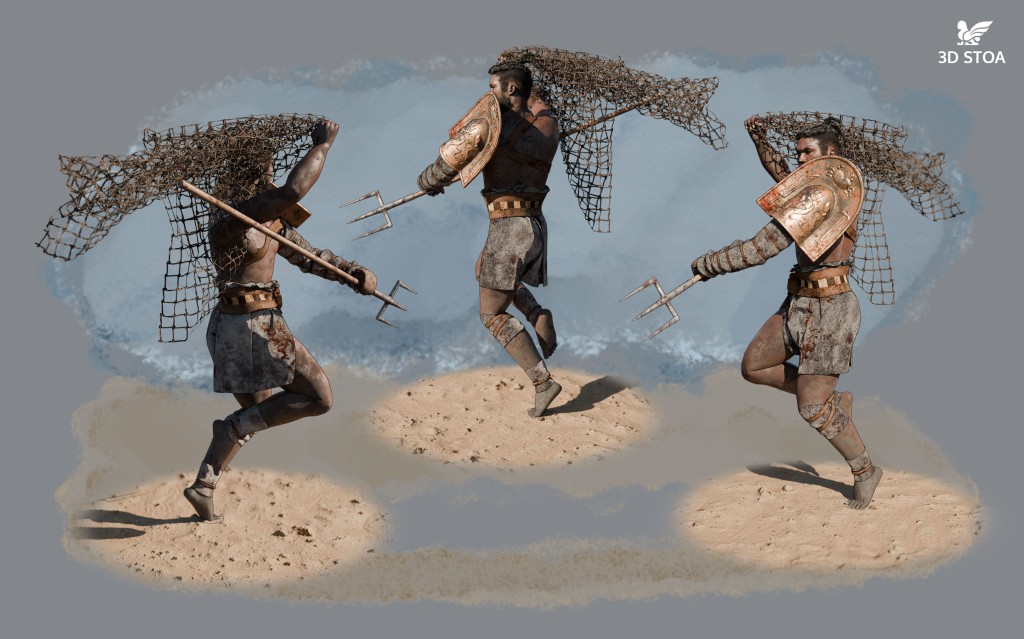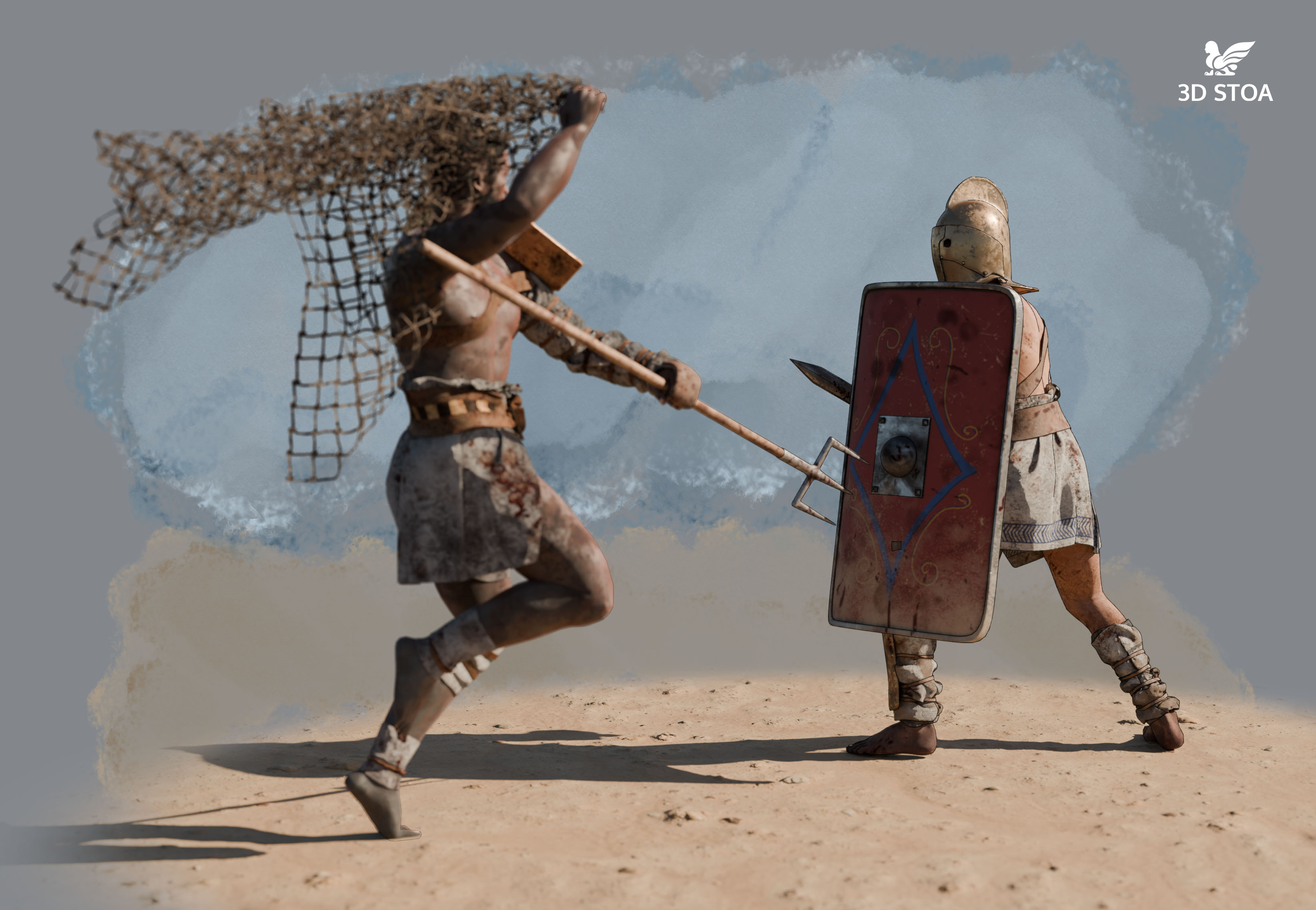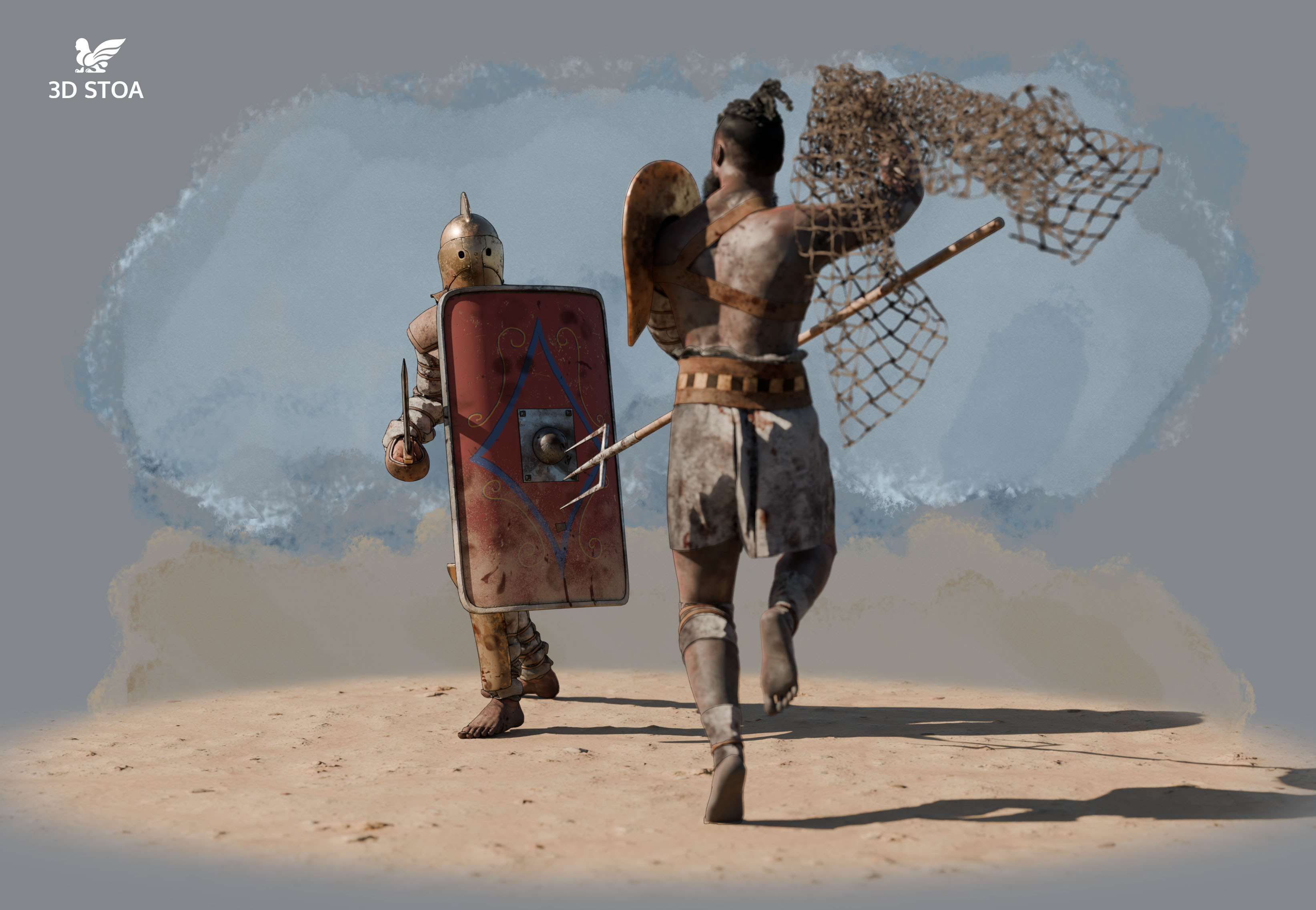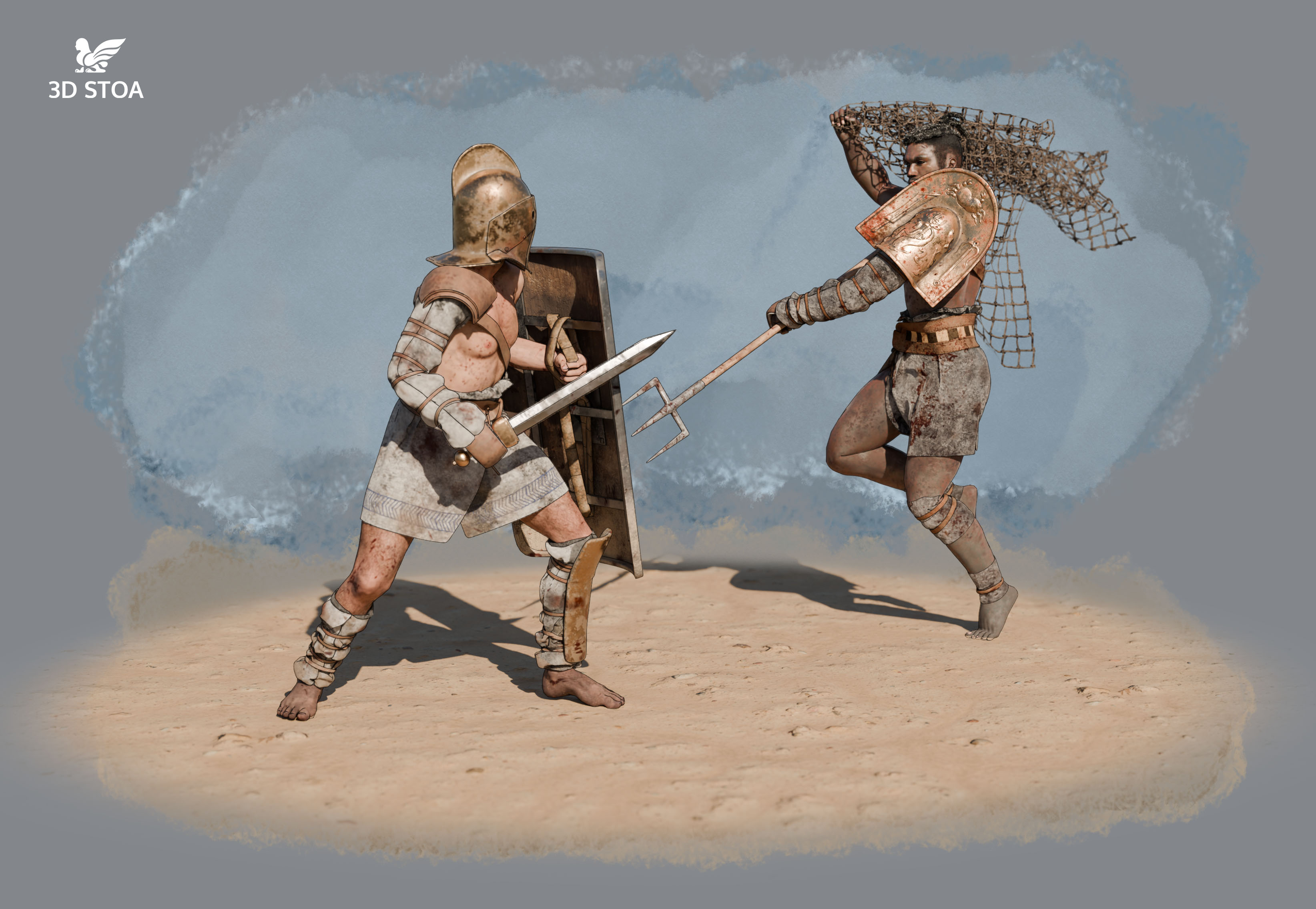No podía resistirme a recrear un combate entre ellos. El retiarius, rápido y ágil, intenta lanzar con la mano derecha la red al secutor mientras le hostiga con el tridente. El secutor, más pesado y defensivo, se protege con su gran escudo mientras busca el hueco para asestar golpes que acaben con las defensas del retiarius. El secutor busca que el combate acabe rápido, persiguiendo e intentando derrotar a su contrincante mientras evita la red de su oponente.