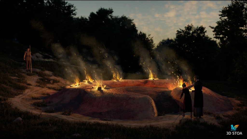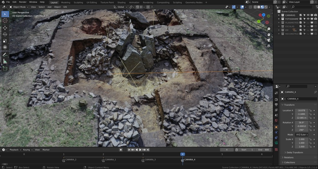 1) En primer lugar, el uso de un modelo 3D fotogramétrico de alta calidad de las excavaciones como base que garantizó el rigor espacial en nuestro trabajo. Éste siempre es un paso fundamental en cualquier proyecto de reconstrucción virtual en 3D del patrimonio ya que contar con un gemelo digital sobre el que poder disponer la reconstrucción virtual nos permite ser mucho más precisos. En este sentido, desde 3D Stoa reprocesamos las fotografías de un levantamiento fotogramétrico realizado por el equipo de excavación, consiguiendo los resultados más certeros geométricamente y, de este modo, partiendo de la mejor base para desarrollar el trabajo.