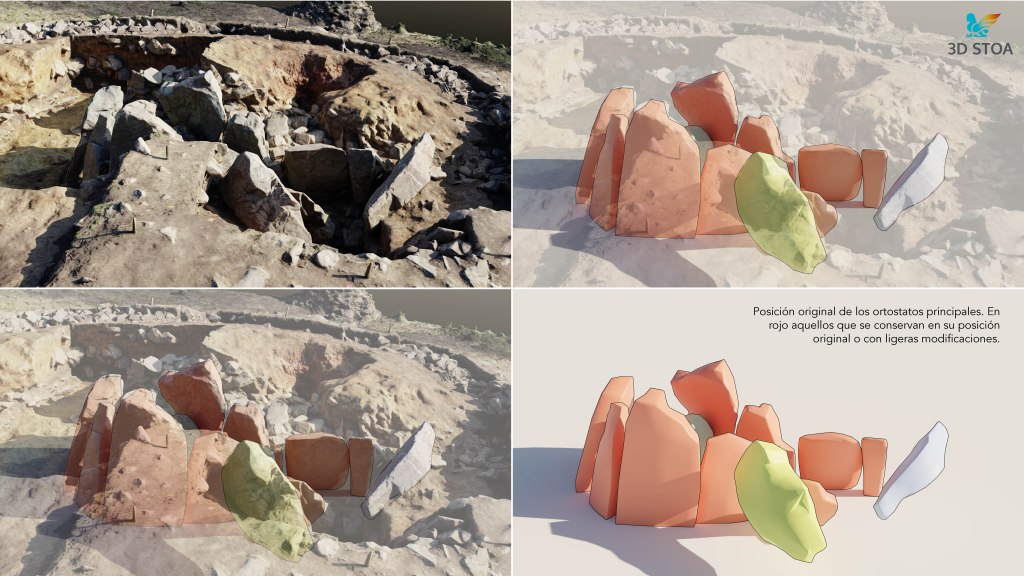 2) En segundo lugar, el uso de bocetos y aproximaciones gráficas que permitieron entender mejor el yacimiento, siempre en colaboración con el equipo arqueológico encargado, y proponer hipótesis reconstructivas. En este sentido, planteamos incluso el uso de animaciones 3D durante la fase de análisis e investigación para, de este modo, restituir la posición de algunos de los grandes megalitos u ortostatos y así poder comprender mejor los restos arqueológicos.