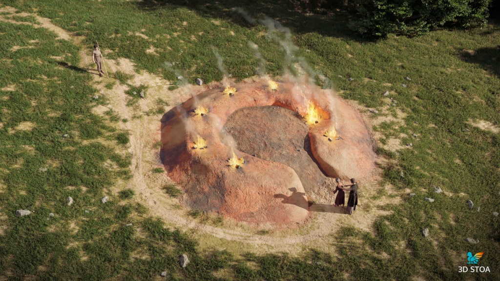 4) En cuarto lugar, el diseño de distintos tipos de vistas resultó fundamental para comprender mejor el yacimiento, ya que buena parte de los elementos que componen las estructuras no eran visibles en el momento de uso. De ese modo, las secciones infográficas se combinan con vistas más realistas – incluso representando el espacio en distintos momentos del día- que permiten entender mejor en su conjunto el enclave histórico.