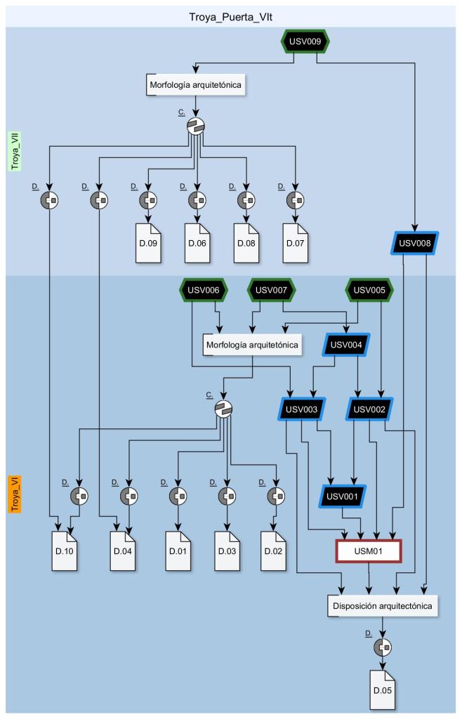 Bajo estas líneas podéis observar el grafo o diagrama de Extended Matrix de la reconstrucción virtual de la puerta meridional de Troya. Podéis descargarlo, junto con el archivo .blend del boceto de volúmenes, desde aquí.
