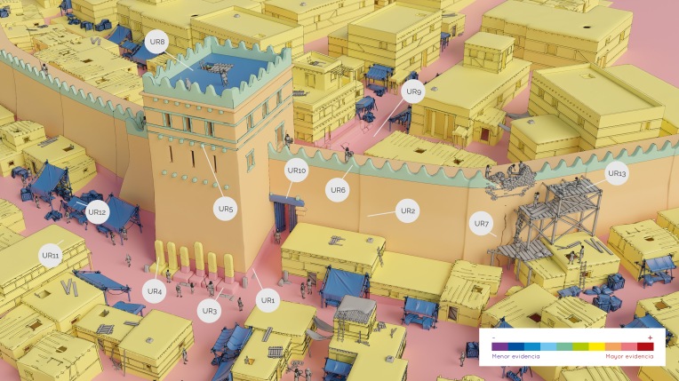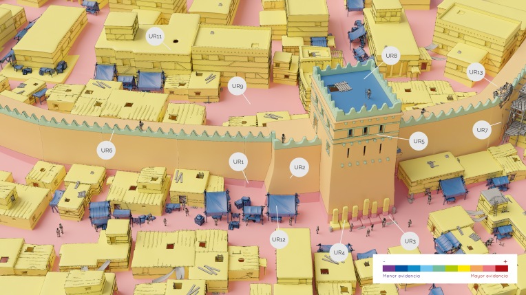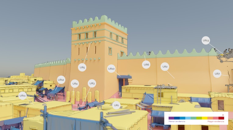 La escala de evidencia histórico-arqueológica es una herramienta visual que nos permite observar, con un solo vistazo, qué elementos de una reconstrucción virtual tienen un mayor nivel de evidencia (tonos más cálidos) y cuales tienen un menor nivel de evidencia (tonos más fríos). Además, cada uno de los elementos está asociado a una Unidad Reconstructiva (UR) que nos permite construir una lista con mayor información para determinar la hipótesis reconstructiva y fuentes de cada elemento. Podéis encontrar todos los metadatos aquí.
